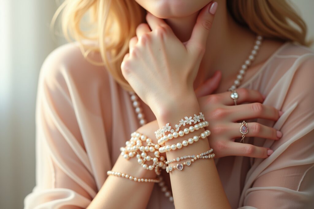 - Metall: Für die Fassung der Perlen und Blüten werden verschiedene Metalle verwendet, darunter Silber, Gold, Edelstahl oder Modeschmucklegierungen. Die Wahl des Metalls beeinflusst nicht nur das Aussehen, sondern auch die Haltbarkeit und den Preis des Armbands.